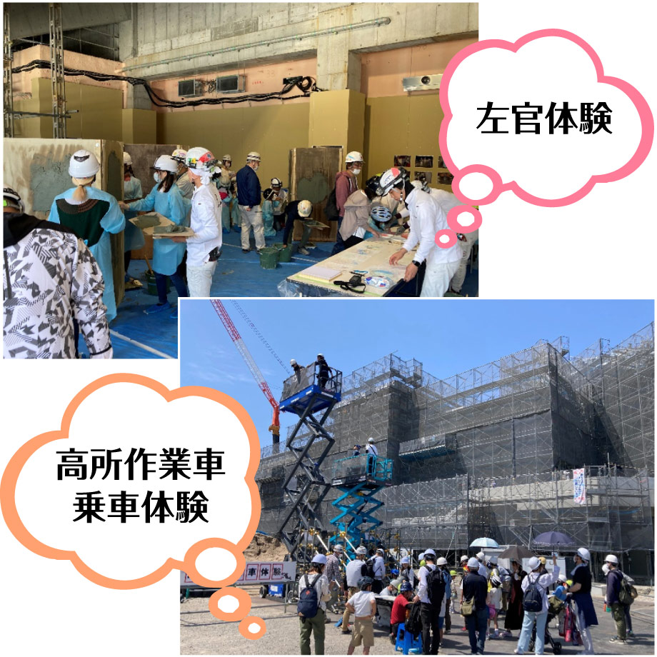 竹中工務店スタッフの方々のご協力のもと、「左官体験」と「高所作業車乗車体験」ができます!